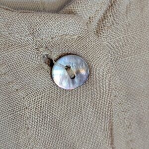 Oatmeal colour linen dress with mother of pearl buttons. Dolman sleeves, two patch pockets, and elasticized waist at back. Includes an accent belt sash that is lighter colour than the dress. See photos for measurements, fits US 8/10.