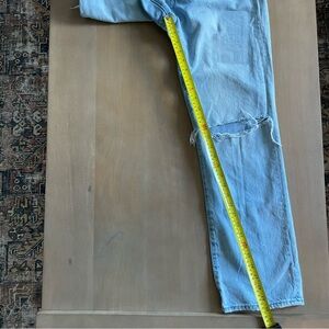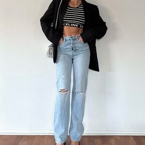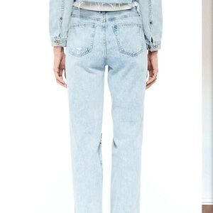 Distressed super high rise straight leg jean. Button and zipper fly. Five pocket construction. Hugs your waist and is relaxed throughout. Distressing at the knee. No stretch.