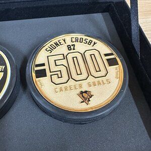Pittsburgh Penguins Sidney Crosby 2 Medallion Puck Set 500 Goal Gold/Black