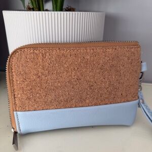 Sweet little wristlet that is cork with baby blue vegan leather.