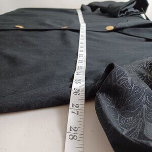 A classic trench coat in a timeless black shade. It has a subtle jacquard texture with a gentle sheen. The material is lightweight, doesn’t have stretch. It’s a relaxed A-line fit with lightly padded shoulders and fully lined. Great for transitional weather in spring and early fall. Like new, excellent condition.