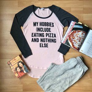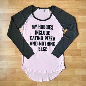 “My hobbies include pizza and nothing else” Pink & Grey Baseball long sleeve t-shirt