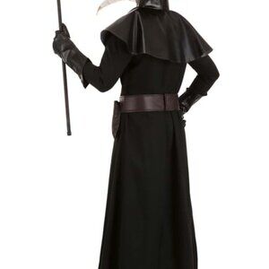 – Key specs: long black robe, faux leather over-shoulder cape with standing collar, wide-brim hat, long faux leather gloves, white beak mask with red mesh eye panels. Belt, boots and staff are not included.