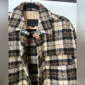 Stay stylish and warm with this plaid belted jacket. Perfect for layering, this jacket features a classic design with a modern twist. Ideal for any occasion.