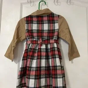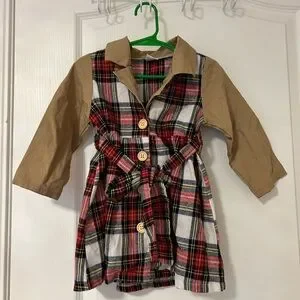 Adorable and unique toddler dress in size 18–24 months! Features a festive red plaid body with contrasting tan sleeves and collar for a cute “mini trench coat” look. Button-front style with a matching tie belt adds extra charm. Perfect for holidays, photos, or stylish everyday wear.