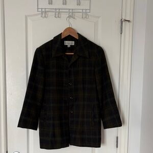 Stylish plaid coat with button-up front. Perfect for layering.