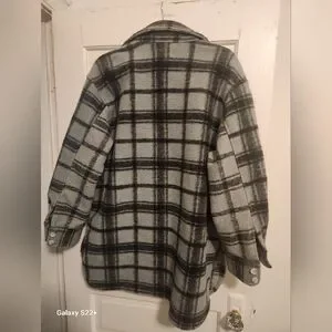 Stylish plaid button-up jacket with a classic design. Features a black and gray checkered pattern.