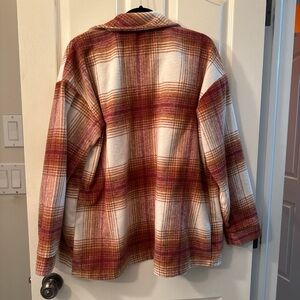 Stylish plaid shacket with button-up front. Features a blend of red, brown, and cream colors.