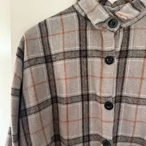 Stylish plaid button-up shirt with a classic design. Features a mix of gray, black, and orange colors. Vintage. Brand unknown.