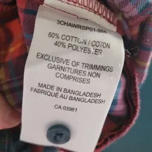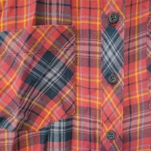 Stylish plaid button-up shirt with front pockets. Features a mix of red, blue, and orange colors.
