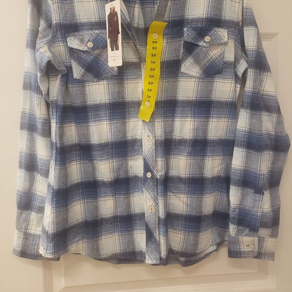 Blue and white plaid flannel. 100% cotton. New with tags. Relaxed fit, size small. From the brand "Weatherproof" sold from the store Mark's Work Wearhouse.
