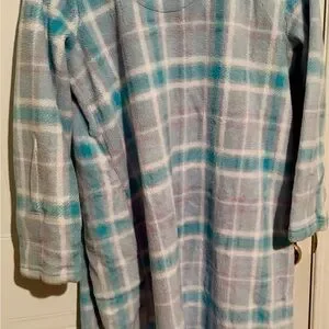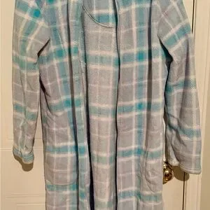 Cozy plaid fleece robe in blue and white. Perfect for lounging.