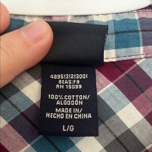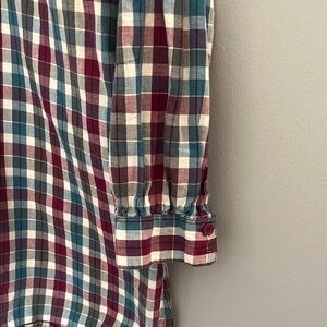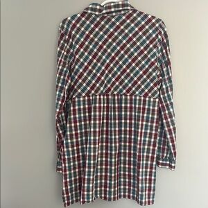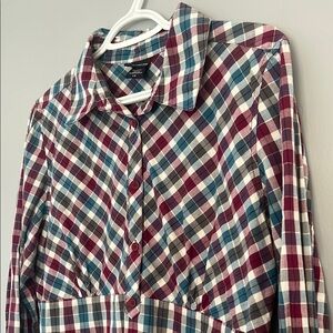 Stylish plaid long sleeve shirt with a classic collar. Features a mix of red, blue, and white colors. Size large, 49 cm pit to pit, 84 cm in length. Has a zipper on the side