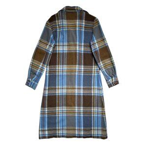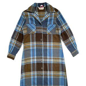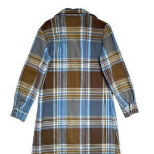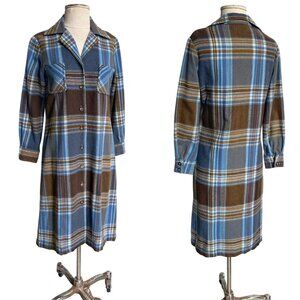 70s vintage plaid shirt dress / shacket / cabin coat , blue and brown wool blend. Perfect for fall.