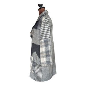 Stay stylish and warm with this plaid patchwork coat. Featuring a blend of gray tones, this coat is perfect for any occasion.