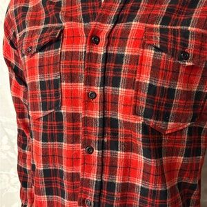 Stylish plaid shirt. Features a vibrant red and black pattern. Perfect for casual wear.