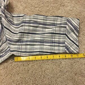 Very good preowned vintage condition, seersucker button down shirt with plaid pattern in dark navy blue, grey and silver metallic thread on white. A robust shirt with plenty of structure.
