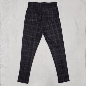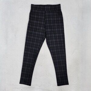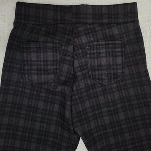 Lily Morgan Plaid Trouser style Leggings for Ladies. Grey Shades, with faint dark red. False pockets front, and real ones in back. Womens size Medium. Polyester and spandex. Soft fleece style interior. Elastic wasteband. 28 inches waist aprox, and 11 inches rise. Great to excellent preloved condition overall.