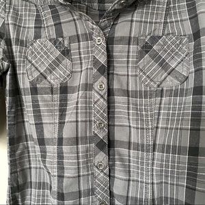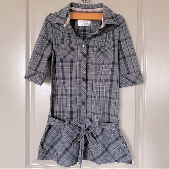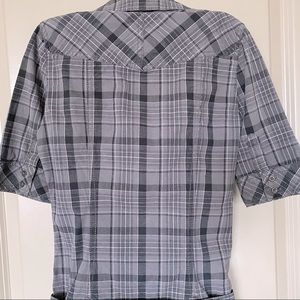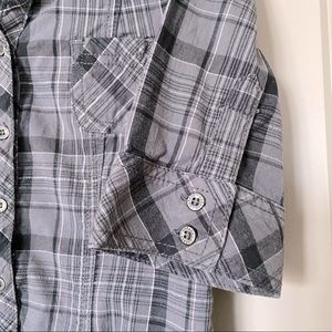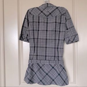 A plaid collared peplum style blouse with button opening and a tie around the waist for a detail. It has 2 patch pockets at the front. It’s half sleeve design with a cuff detail and button makes it unique.