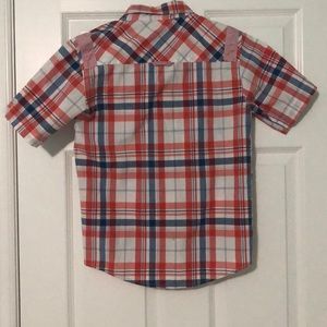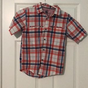 This red/orange, blue, and white boys button-up is a great spring/summer wear. Great for a formal casual look. In brand new condition, this piece will make a great addition to any wardrobe.