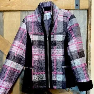 Beautiful women’s lightweight plaid jacket in black, grey, and pinks/purple