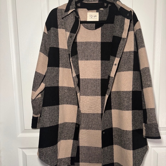 Beige and black plaid patterned shacket. Long jacket, hits around the knee depending on height. Great condition. Unlined with Button up front enclosure.