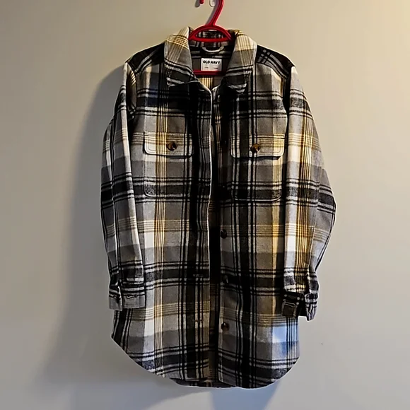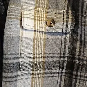 tan/white/cream/grey/black plaid shacket. sz small but fits oversized. barely worn, excellent condition.