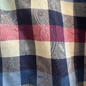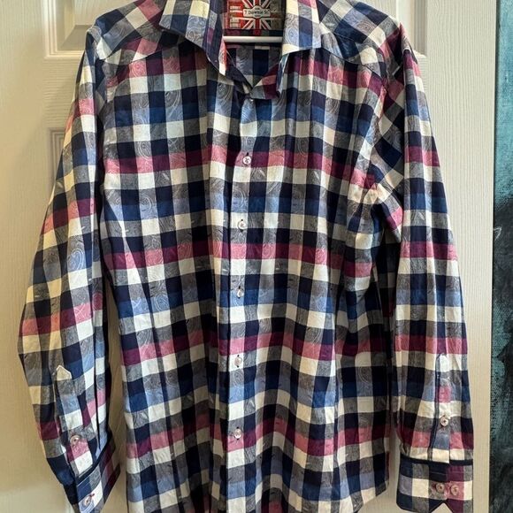 Stylish plaid button-up shirt with a classic design. Features a mix of blue, red, and white colors.