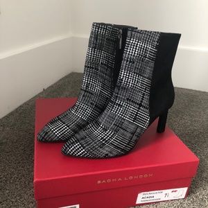 Gorgeous plaid and suede, colour blocked bootie. New in box. Suede/Leather upper and lining. Inside zipper. 2 1/2” heel. Size 7 1/2.