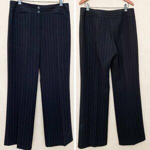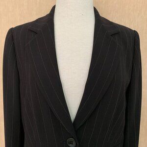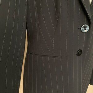 This is a sophisticated and classic black pinstripe pantsuit from the brand Planet. The set includes a single-breasted blazer and a pair of matching trousers. The blazer features a two-button closure, a notched lapel, and faux flap pockets. The pants have a flat front with a hook and button closure. The material is a high-quality blend of 69% triacetate, 30% polyester, and 1% cupra, with a lining of 55% nylon and 45% acetate. Made in China.