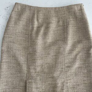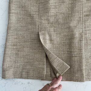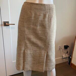 Features: midi, single wide pleat front & back, lined, side invisible zip & internal button closure, neutral, great paired with favorite blouse sweater + boots/heels, classic, vintage