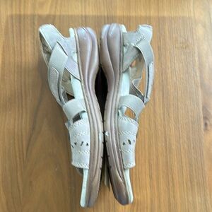 Leather sandals with metal decor and elastic and leather slip on. Taupe colour. Comfort style. NWOT.