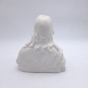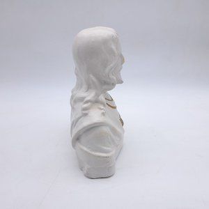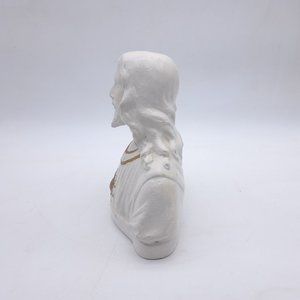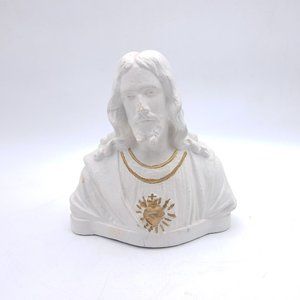 A white painted plaster bust of Jesus with the Sacred Heart in gold color on his chest. It is 9" tall, 8 3/4" wide and about 4" deep. There is wear as in the pictures, notably on the nose; a corner in the rear is a manufacturing defect (it is under the paint) rather than damage.