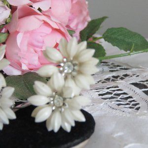 Super cute! This pair of vintage clip on earrings from the 1950s. The earrings have 2 double daisies with sparkling rhinestone centres.The perfect way to compliment a boho chic outfit. The earrings are white plastic so they are extremely versatile. The could also be upcycled into a completely new look. A fun vintage touch!