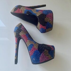 Steve Madden 6” platform high heels Dyvinal. Inspired by Daffodile by Christian Louboutin, these platform heels offer comfort, and flair with multi-colour gems.
