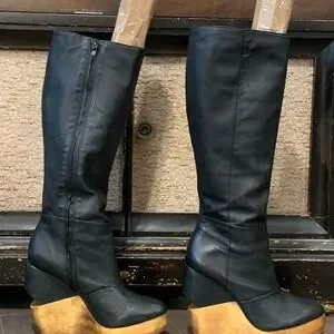 -black leather, rubber sole, wooden wedge platform, full length inner zip