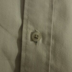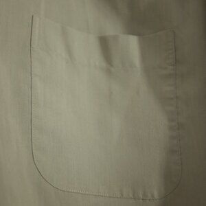 This Platinum Mode dress shirt in a grey-green solid color is crafted from a lightweight cotton blend, offering comfort with a sleek appearance. The shirt features a traditional button-up design with a chest pocket, perfect for both formal and casual wear. There is a little bit of pilling, reflecting its pre-owned condition