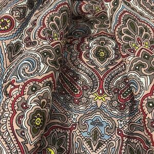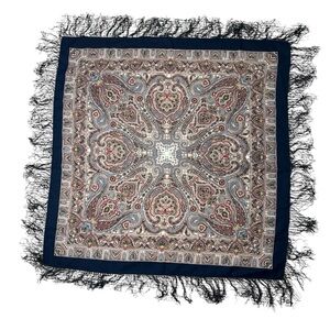 This is a unique design and richly colored artisan shawl. Paisley pattern inside a navy blue border with deep long fringes of (of possibly silk?) threads.