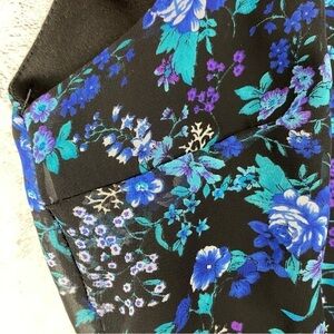 Playback Mini Dress. Women's Size Large. 100% Polyester. Blue and green floral pattern. Fully lined in black. V-Neck front and back. Sleeveless. Elastic waist. Flare skirt. Ruffle accent.