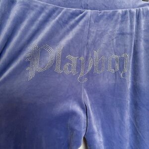 Playboy old English y2k Blue Velour Pants with Logo and rhinestone XL periwinkle