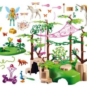 The **Playmobil 9132 Magical Fairy Forest** invites children aged 4 and up into a whimsical world filled with magic and nature. This enchanting set features a splendid throne for the Fairy Queen, a treasure chest filled with semi-precious gems, and a large cauldron for brewing magical healing potions. The forest canopy includes a sunshade and flower lanterns that light up in the dark, creating a magical atmosphere. Fairies can relax on leaves stretched between tree trunks, swing on a suspended swing, or rest in large nests that also serve as storage for musical instruments and books. The set includes three caves for animals or hidden treasures and encourages imaginative play with its detailed accessories and charming animals. Measuring 38 x 33 x 31 cm, this set offers over 200 pieces for creative storytelling and fairy adventures.
