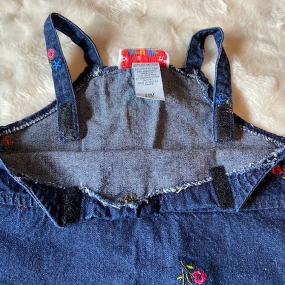 Please Mum Canada Vintage jumper-style denim dress with velcro straps. Dress is in very good pre-loved condition with pretty embroidered flowers. Made in Canada. From 2002. 100% cotton. machine wash gentle cycle. This post is for one item only. Mix and match for bundle price. Colour depends on device/screen settings and lighting in pictures. All measurements are approximate and may slightly vary. Measurements are taken by hand with item laying flat and unstretched. All items are from my smoke free home.