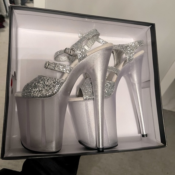 Pleaser glitter sandals, size 7 in 8 inch heel. Brand new, never worn, comes with shoe box and protective covers. Selling as they do not fit me.