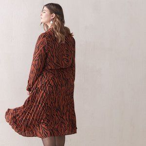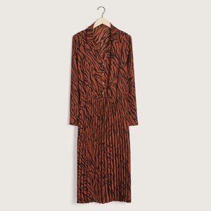 Plus size midi dress cut in a rich cognac silky crepe fabric with contrasting black zebra print. Its silhouette is fit at the top and flared at the bottom for fluidity in movement. In excellent used condition - only worn a few times.