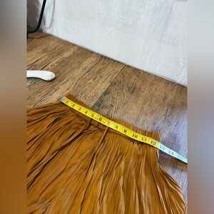 Flowy pleated shorts in a rich mustard yellow color, made from lightweight polyester. Features an elastic waistband with adjustable drawstring and tassel detail. Stylish and comfortable, perfect for warm-weather outfits or a boho-chic look. Size S.