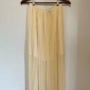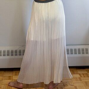 This elegant light taupe pleated maxi skirt features a flowing design with a sheer hem from the knee down, adding a touch of sophistication and movement to your wardrobe. Perfect for dressing up or down for a variety of occasions. Worn twice and in perfect condition.