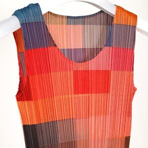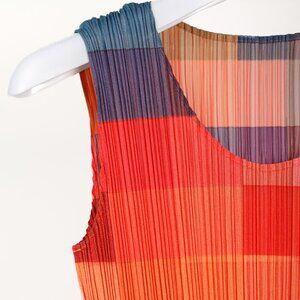 Elevate your style with the Pleats Please Issey Miyake Archival Multicolour Gradient Squares Dress. Crafted from lightweight, stretchy, and technical-pleated polyester, this dress offers a flattering and comfortable fit. With its round-neckline, sleeveless design, and unique pleated pattern, this dress is effortlessly chic and versatile. A must-have for any fashion-forward wardrobe.