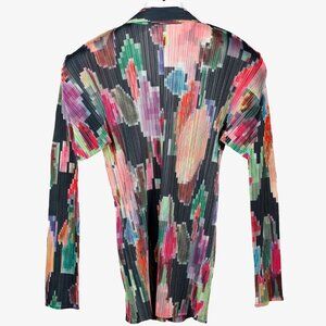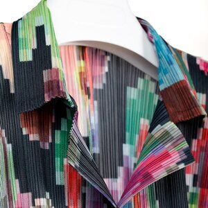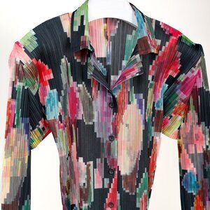 This Pleats Please Issey Miyake Archival Pixelated Multicolour Flower Jacket is effortlessly chic and versatile. Crafted from lightweight and stretchy technical-pleated polyester, it features a notched collar, long-sleeve design, and front button closure. The uniquely pleated design offers a flattering and comfortable fit, making it a must-have for any fashion-forward wardrobe.