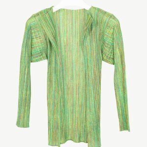 Made in Japan, this cardigan from Issey Miyake's Pleats Please line is crafted in a green satin pleated all over with a multicolour pixel pattern throughout. It features long sleeves, angular shoulders, and an open front.