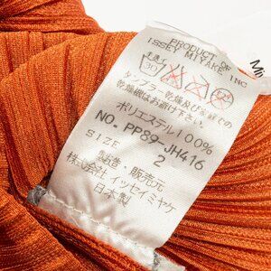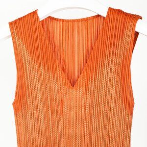 Made in Japan, this dress from Issey Miyake's Pleats Please line is crafted in an orange satin pleated all over, and is elevated with a gold metallic foil pattern throughout. It features a sleeveless design, a V-shaped neckline, side slits, and a maxi-length hem.